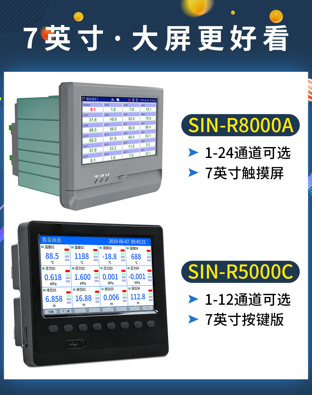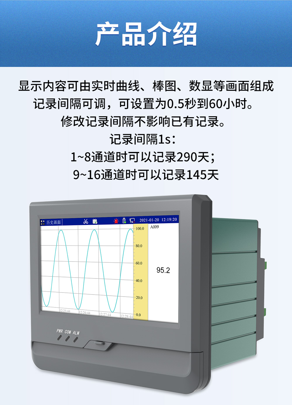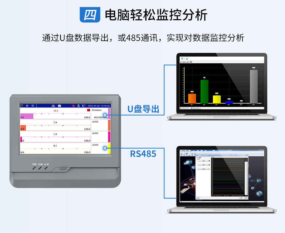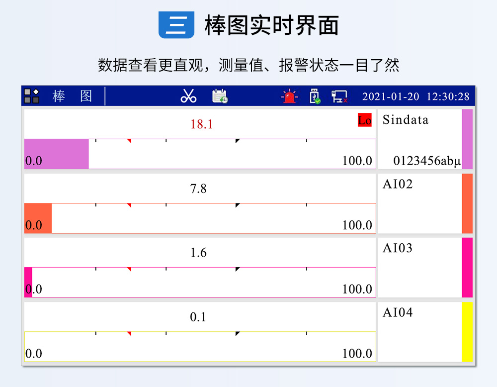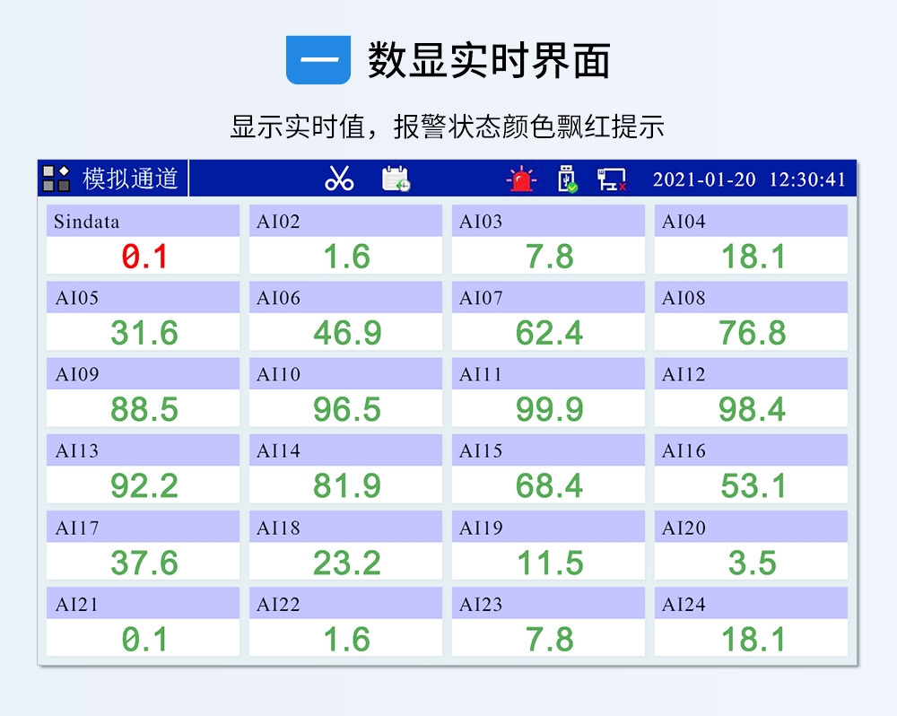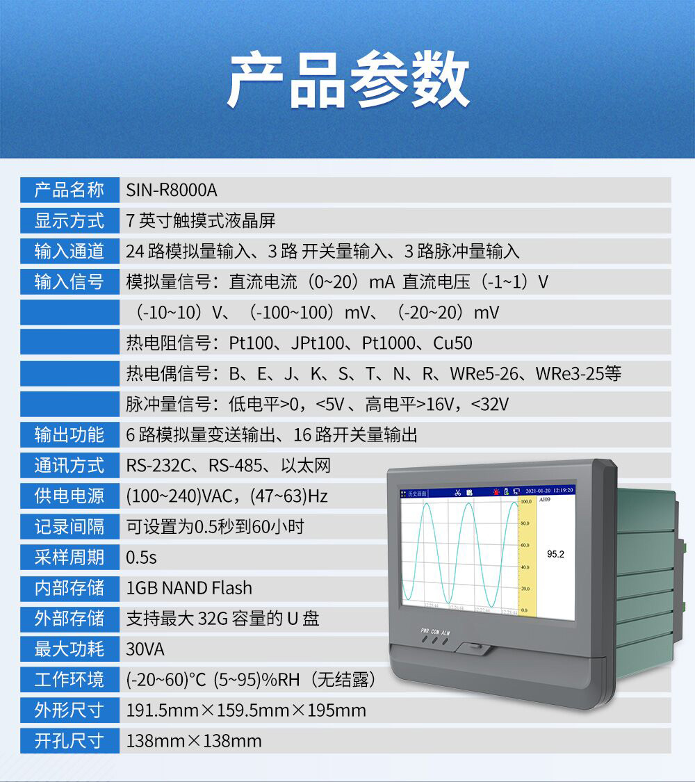 觸摸式彩色無紙記錄儀具有 60 個(gè)運(yùn)算函數(shù)、24 路模擬量輸入、3 路 開關(guān)量輸入、3 路脈沖量輸入、6 路模擬量變送輸出、16 路開關(guān)量輸出, 可實(shí)現(xiàn)運(yùn)算、顯示、記錄、報(bào)警、分析統(tǒng)計(jì)報(bào)表、高速采樣等功能,通 過 RS-232/RS-485 和以太網(wǎng)通訊接口,可實(shí)現(xiàn)遠(yuǎn)程實(shí)時(shí)監(jiān)控、組態(tài)管理、 歷史數(shù)據(jù)讀取等功能,通過 U 盤可實(shí)現(xiàn)組態(tài)管理、監(jiān)控畫面管理和歷史 數(shù)據(jù)管理等功能。