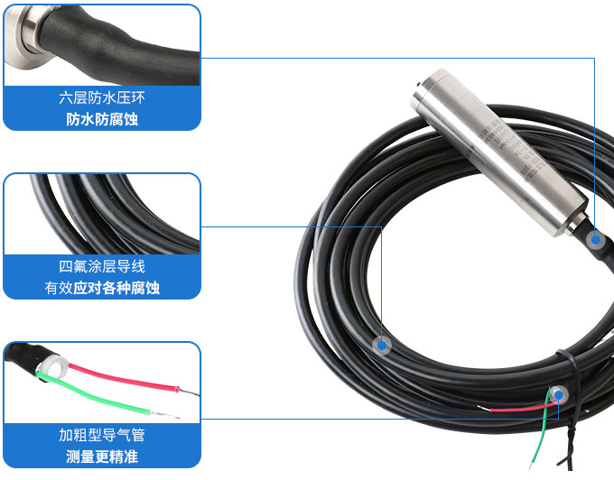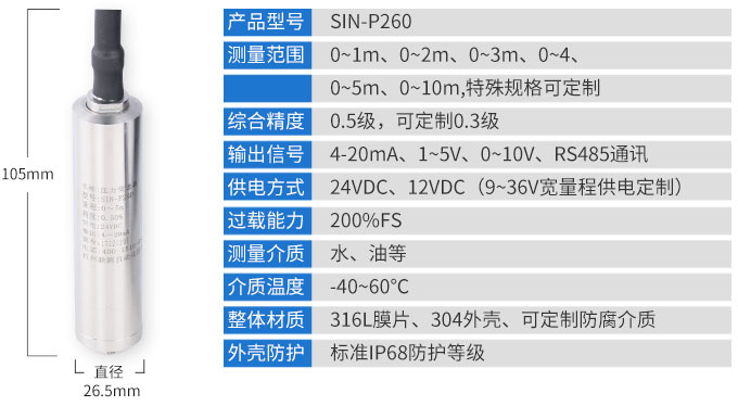 SIN-P260投入式液位變送器由高性能擴(kuò)散硅壓阻式壓力傳感器作為測(cè)量元件,把與液位深度成正比的液體靜壓力準(zhǔn)確測(cè)量出來(lái)。