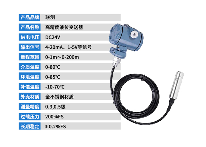 SIN-P261投入式液位變送器由高性能擴散硅壓阻式壓力傳感器作為測量元件,把與液位深度成正比的液體靜壓力準確測量出來,并經(jīng)過信號調(diào)理電路轉(zhuǎn)換成標準(電流或電壓)信號輸出,建立起輸出信號與液體深度的線性對應關系,實現(xiàn)對液體深度的測量。產(chǎn)品精度高、體積小,直接投入液體中,即可測量出變送器末端到液面的液體高度,使用方便。適用于石油、化工、電廠、城市供水、水文勘探領域的液位測量與控制。經(jīng)過長期老化及穩(wěn)定性篩選,產(chǎn)品性能穩(wěn)定可靠,能夠適用應用于環(huán)境比較惡劣的露天現(xiàn)場,同時能夠現(xiàn)場液位顯示,零點,滿程可遷移。
