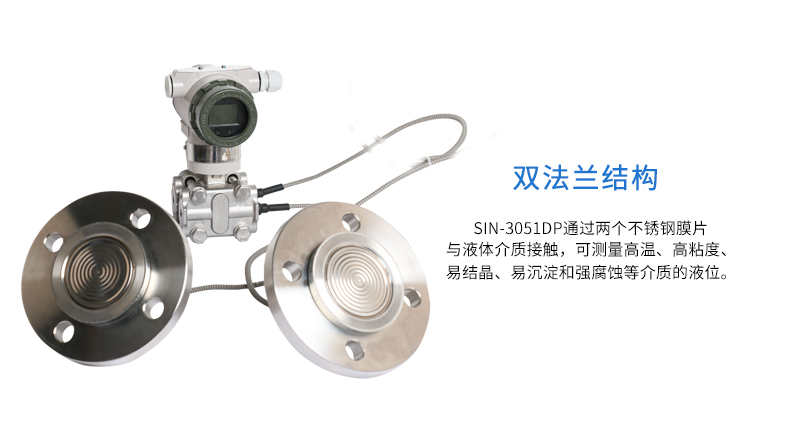 SIN-3051DP雙法蘭差壓液位變送器是一種為避免被測介質(zhì)直接作用于變送器的遠傳隔離膜片接觸而采用的差壓式變送器(結(jié)構(gòu)測量法)。