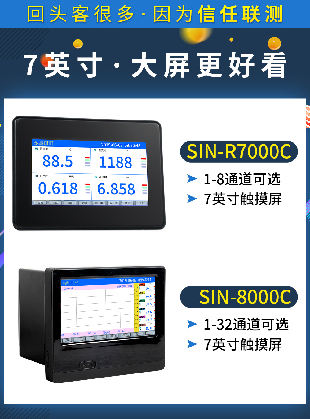 聯(lián)測儀表SIN-R8000C可帶12路報警輸出或12個變送輸出,RS232/485通訊接口,以太網接口,微型打印機接口和USB接口,SD卡插座;可提供傳感器配電;采用拔插式間距為5.08的接線端子,方便電氣連接;具有強大的顯示功能,實時曲線顯示,歷史曲線追憶,棒圖顯示等。人性化的外觀設計、完美的功能體現(xiàn)、可靠的硬件品質、精湛的制造工藝,使本產品具有更高的性能價格比。